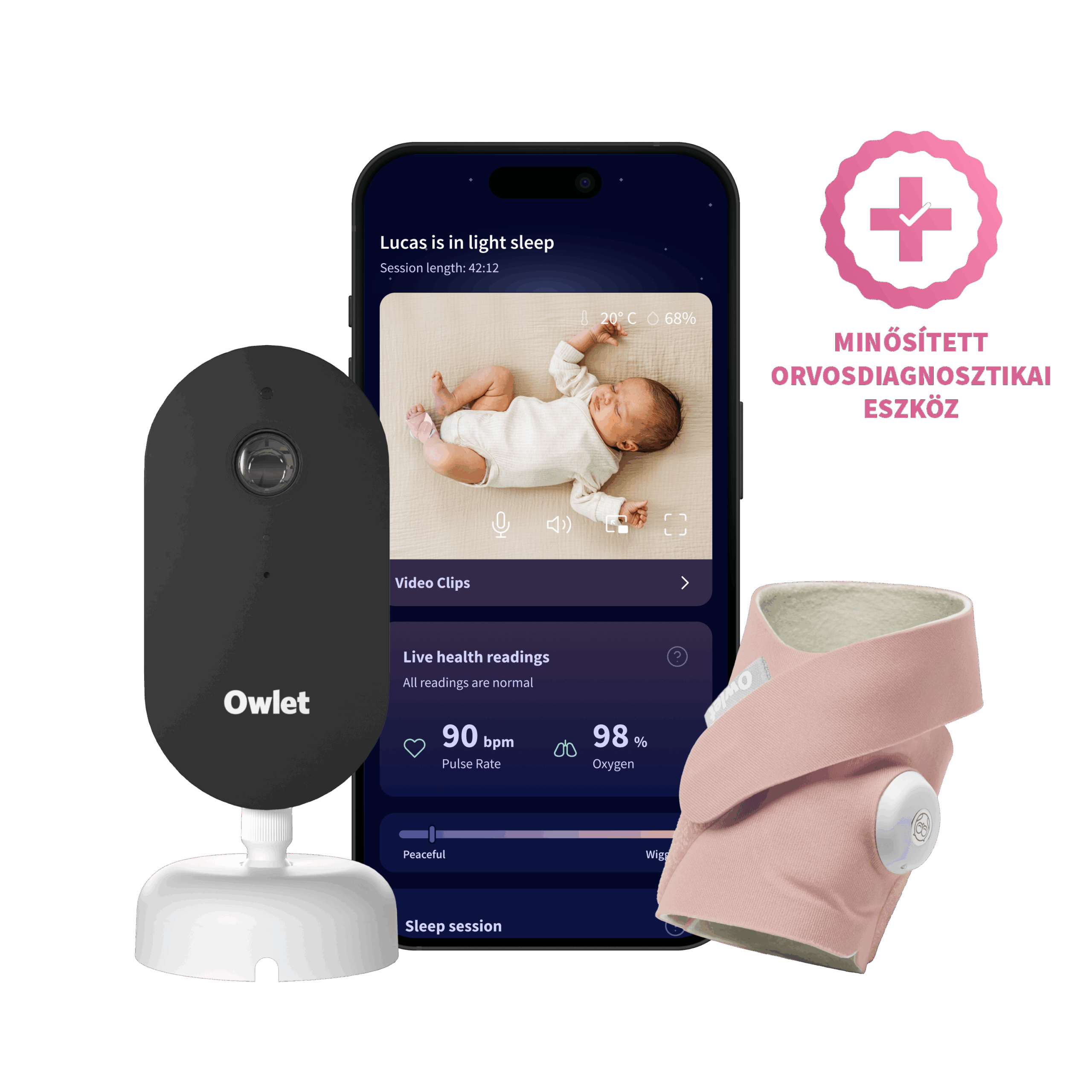 Owlet Dream Duo™ (3. generáció) szett – Owlet Dream Sock™ Okos babazokni 0-18 hónapig (Matt rózsaszín) + Owlet Dream Sight™ kameraElérhetőség: 6 készleten